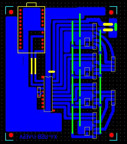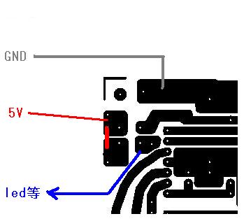 実際のパターンをパターン側から見た図です。 上記の右上の部分を左右反転した形になっています。 外部電源は、ボリスイッチ1、ボリスイッチ2を 介して供給します。 外部電源の5VとGNDは、左の図の位置に配線します。 |